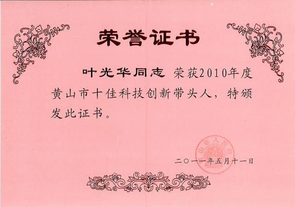 公司总经理叶光华同志获得2010黄山市十佳科技创新带头人