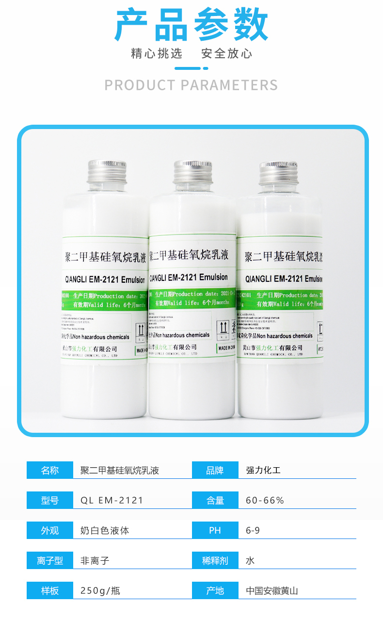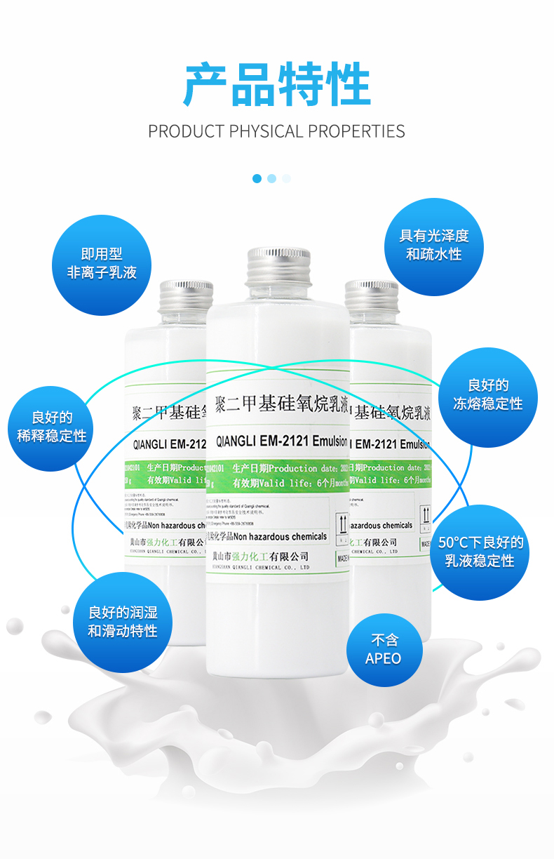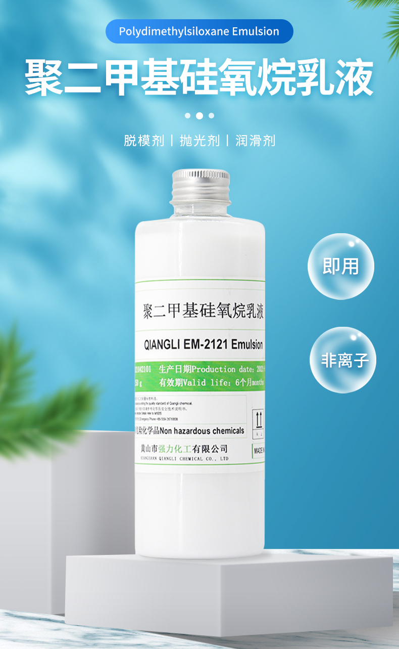 QIANGLI EM-2121 Emulsion是活性含量为60%的非离子聚二甲基硅氧烷乳液,因为其非离子性,它可广泛用于各种体系,如非离子,阴离子,阳离子乳化体系或不形成复合体的聚合物体系,
