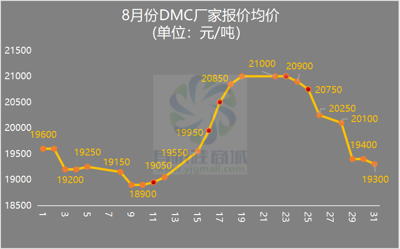 金九银十的首发之日,有机硅仍处在上下游博弈阶段,DMC在8月先跌后涨再走跌,价格走势呈倒N字形。8月行情基本可以分三个阶段:上旬,难敌需求施压,龙头单体厂DMC跌至18800元/吨,随即封盘拉涨,刺激一波下游抄底备货。中旬受原料金属硅大涨提振,国内单体厂借势延续拉涨,DMC在8月19日冲至21000元/吨;临近月末,终端需求持续萎缩,市场避险情绪再起,同时金属硅也重启连跌模式,DMC又回到月初低点,截止31日 ,山东单体厂DMC跌至18800元/吨。今日9月1日,持稳开盘!