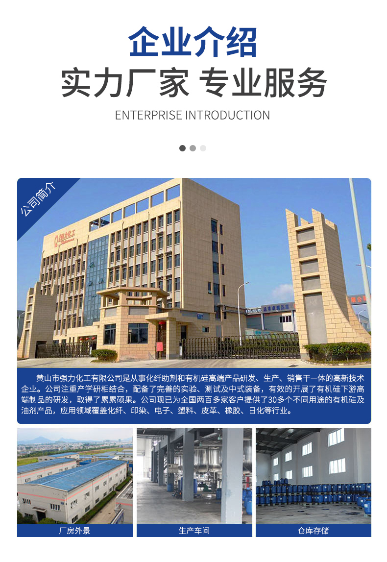 集研发,创新,生产,销售相结合,重点以生产研发有机硅新材料:以二甲基硅油、乙烯基硅油为主,以羟基硅油、有机硅乳液,氨基硅油,纺织助剂为辅的多元化化学工厂。