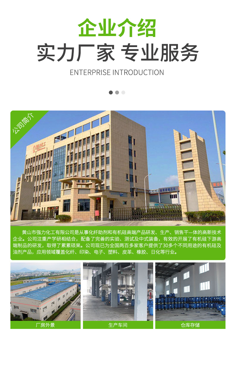 集研发,创新,生产,销售相结合,重点以生产研发有机硅新材料:以二甲基硅油、乙烯基硅油为主,以羟基硅油、有机硅乳液,氨基硅油,纺织助剂为辅的多元化化学工厂。