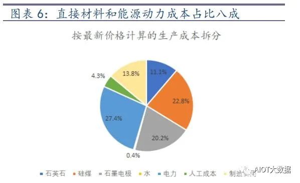 直接材料和能源动力是工业硅主要的成本构成,直接材料包括:硅矿石、石油焦、硅煤、石 墨电极等,能源动力包括:煤炭、电力。以合盛硅业 2021 年工业硅生产成本拆分看,直接材料 占比 46%、能源动力占比 32%。我们按照最新的原材料价格测算新疆工业硅企业成本构成,石英 砂占比 11%、硅煤占比 23%、石墨电极 20%、电力占比 27%。